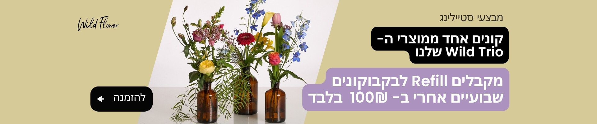 - Wild Refill היא הדרך החכמה לשמור על הבית או המשרד תמיד מלא בפרחים רעננים וסטייל עדכני – בלי מאמץ. רוכשים את אחד הבקבוקים הייחודיים שלנו פעם אחת, ומשם אנחנו כבר דואגים להכול: בכל תקופה תקבלו אליכם ריפיל חדש של פרחים, מותאם לעונות השנה ולזמינות הכי יפה שיש. תוכלו לבחור את הסטייל המועדף – צבעוני מלא חיים, פסטלי רך או לבן אלגנטי – וליהנות מגמישות מלאה: חידוש חד־פעמי או מנוי משתלם שנכנס לשגרה ודואג להכול. היתרון הגדול? גם חיסכון, גם קיימות (משתמשים שוב באותו בקבוקון), וגם מראה מתעדכן שלא נמאס ממנו לעולם.