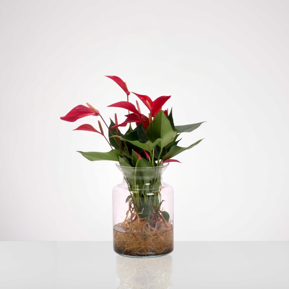 צמח אנטוריום מרשים בגידול הידרופוני (על בסיס מים), המגיע בתוך ואזת זכוכית שקופה למראה נקי, מודרני ואלגנטי. גובה הכלי והצמח כ-50 ס"מ, והפריחה מגיעה בגווני אדום. פריט עיצובי מושלם לבית או למשרד הדורש תחזוקה מינימלית ומהווה מתנה ייחודית ומרגשת. חשוב לשמור על כמות המים בכלי כפי שהיא בתמונה ובנוסף להחליף את המים כל 3-4 ימים למים קרירים.