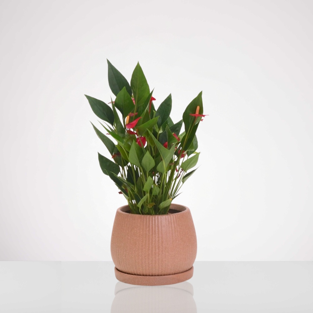 עציץ אנטוריום אדום מזן "מולטי" המרהיב, המתאפיין בצימוח צפוף ובכמות יוצאת דופן של פרחים – לפחות 15 פרחים בכל עציץ! הצמח מגיע בכלי תואם (קוטר 12 ס"מ) ולגובה כולל של כ-47 ס"מ. בחירה קלאסית, עוצמתית ומרשימה המעניקה זריקת צבע עזה, אנרגיה וחיוניות לכל חלל בבית או במשרד.