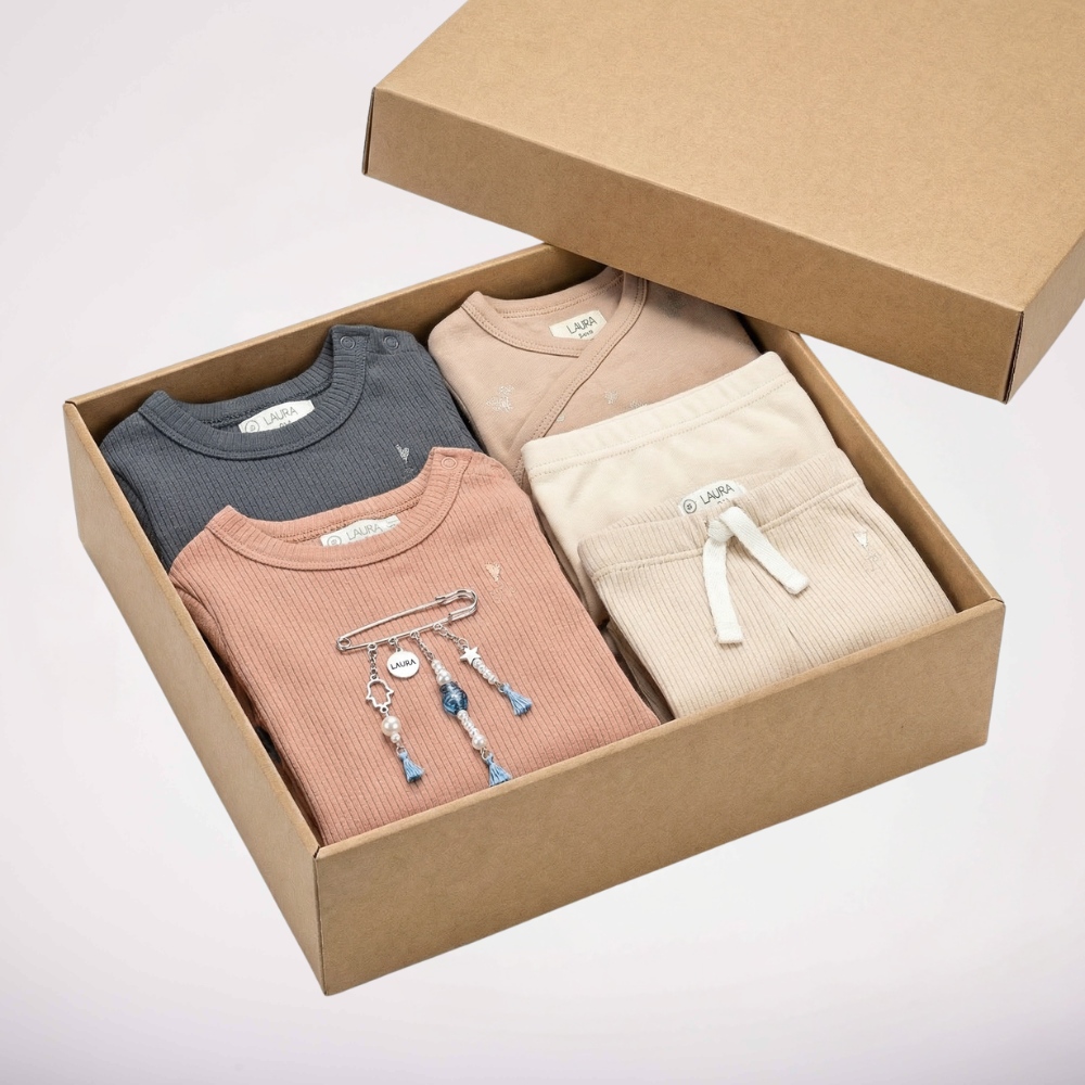 בנוי בדיוק לימים הראשונים: זוג בגדי גוף מבד ריב אורגני במידה 0-3, חליפה של בגד גוף ורגלית מבד אינטרלוק 100% כותנה במידה 0-3, מכנס מבד ריב 100% כותנה במידה 0-3, וסיכת עין הרע לעגלה לטאץ׳ מתוק ומגן. שילוב נקי, נעים, ומתנה שמרגישה פרקטית ומרגשת.