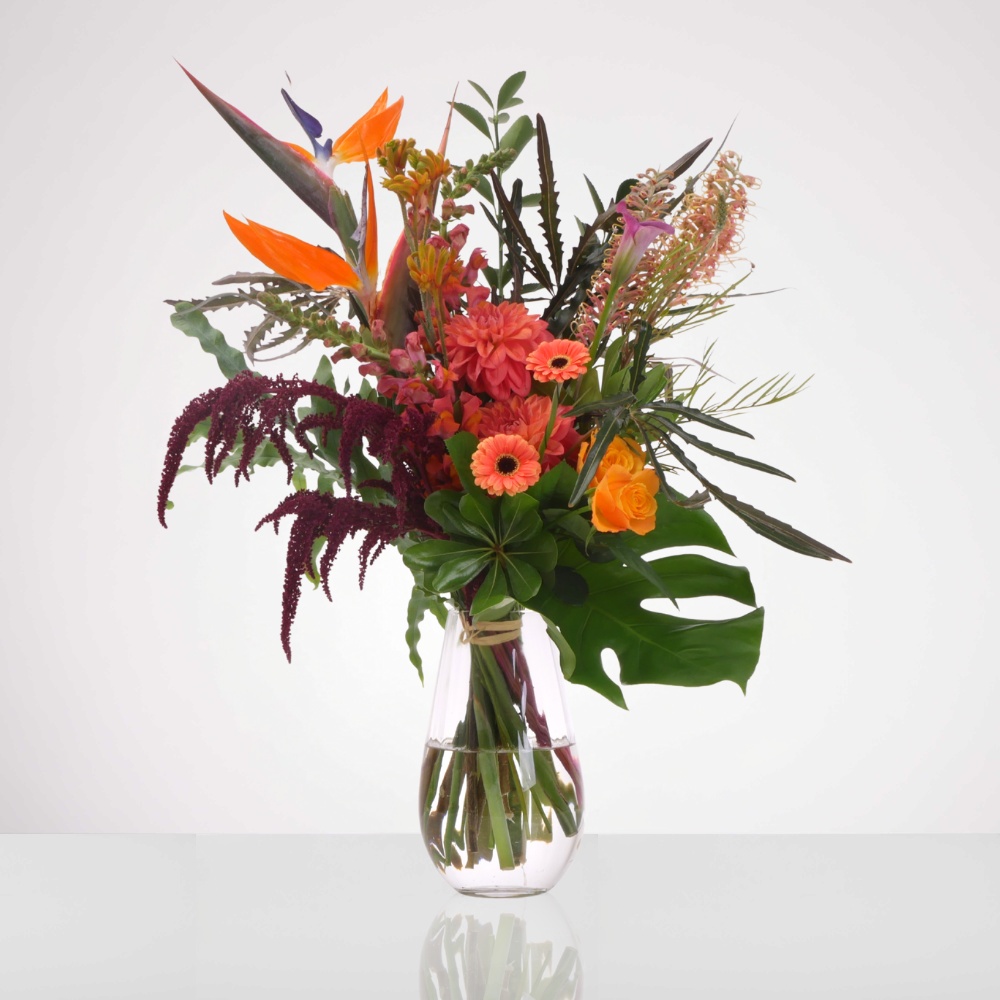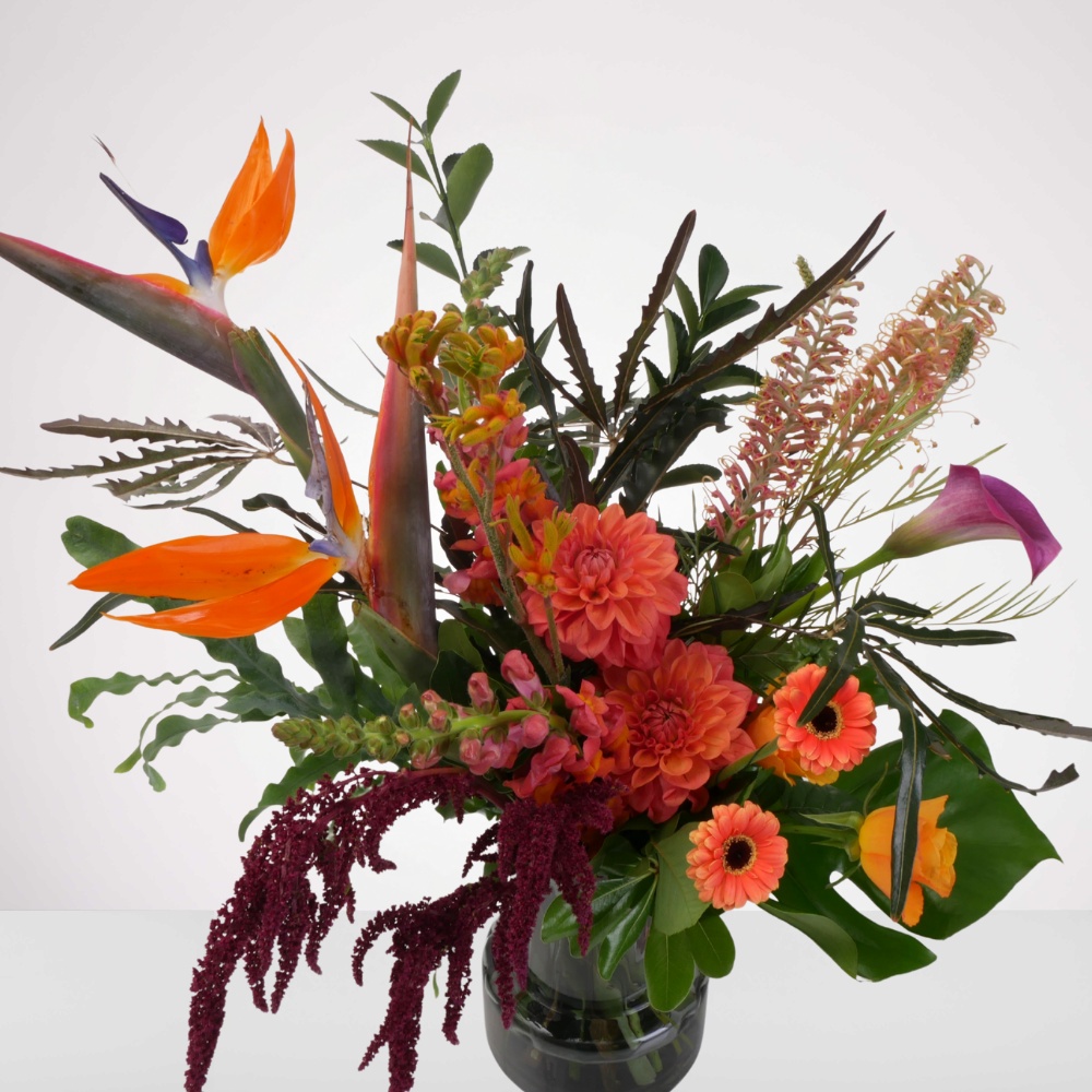 זר שכולו שיר הלל לטבע הפראי, בהובלת פרחי "ציפור גן עדן" המלכותיים. השילוב בין הגוונים החמים והעזים לבין הירוק העמוק יוצר תחושת חופש, חיוניות ואנרגיה של יער גשם רחוק. הזר עוצב כיצירה שלמה וארכיטקטונית, ולכן הוא מגיע בגודל אחד מדויק (One Size) – בחרנו לא לשנות את הגודל כדי לא לפגוע באיזון המושלם ובקומפוזיציה המרשימה שהמעצבים שלנו יצרו עבורכם. הזר מגיע ללא אגרטל (ניתן להוסיף את כלי הזכוכית המופיע בתמונה בתוספת תשלום לשדרוג המראה).