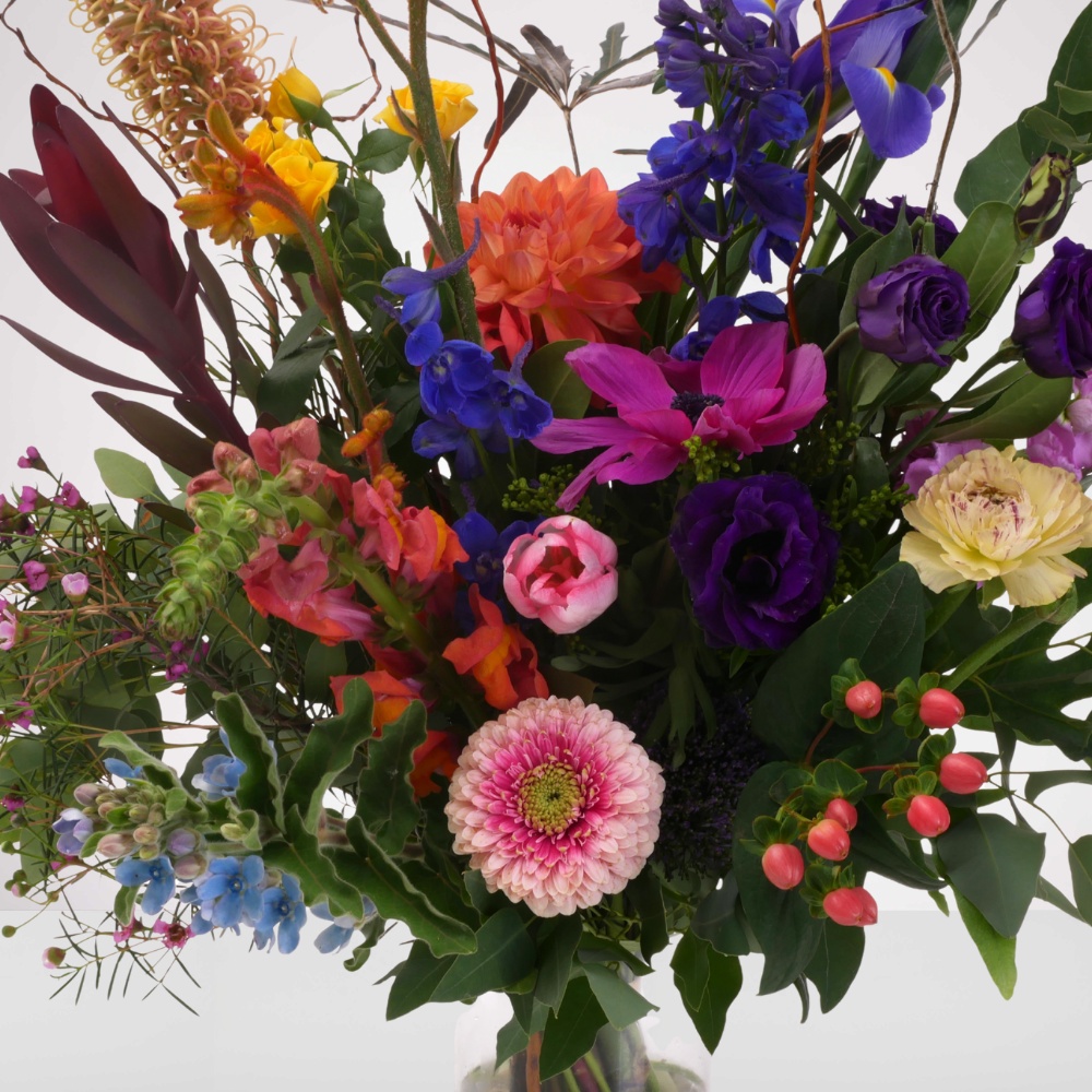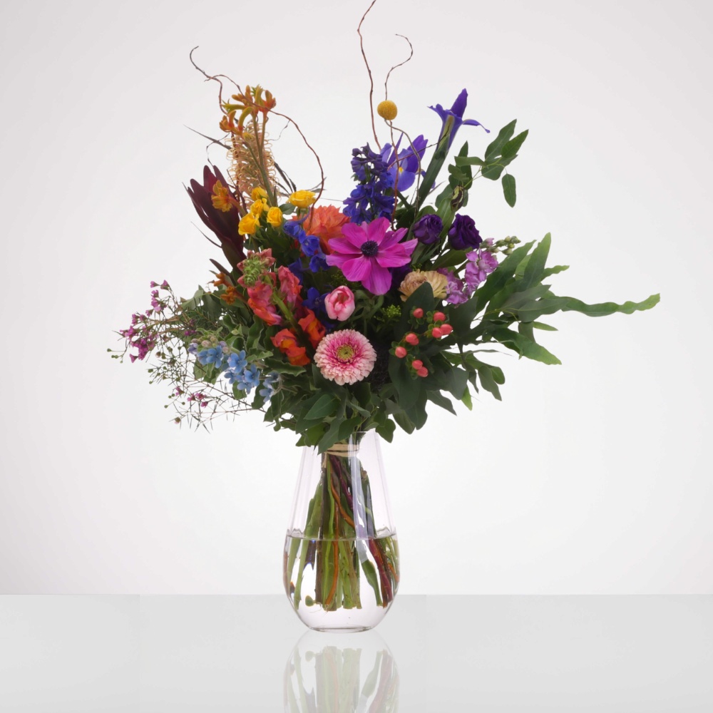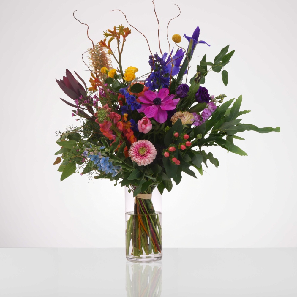 זר עשיר ומרגש ששובר את השגרה ומכניס אור ושמחה לכל בית. העיצוב מתאפיין במראה "פראי" (Wild) ומשוחרר, המשלב מגוון פרחי חורף מיוחדים בגוונים עמוקים של סגול, כחול וורוד, לצד נגיעות צהובות ומאירות וענפים דקורטיביים שמעניקים גובה ועניין. זר שמרגיש כאילו נקטף זה עתה משדה פורח וקסום. הזר מגיע ללא הכלי שבתמונה (ניתן להוסיף את כלי הזכוכית המופיע בתמונה לשדרוג המראה).