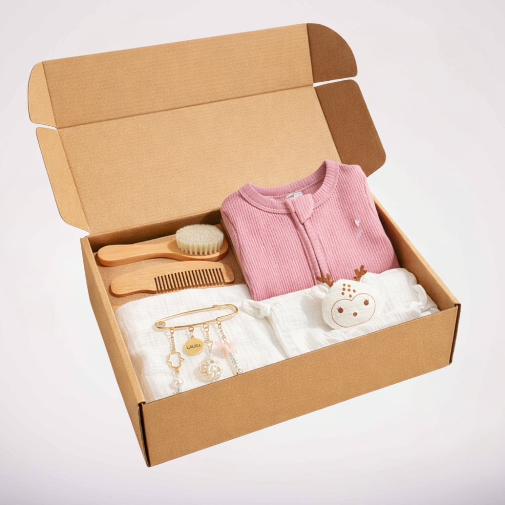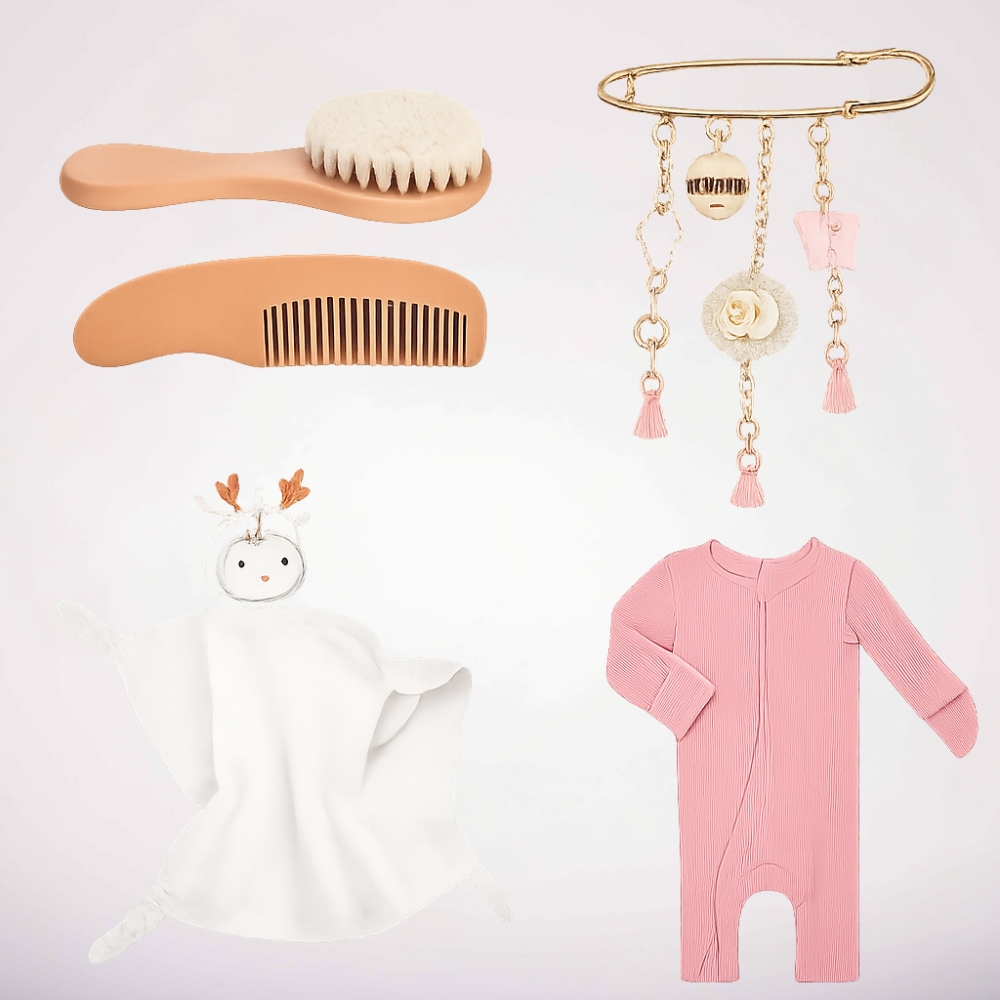 מארז פינוק מלא סטייל לתינוקת: אוברול ריב מבד אורגני במידה 0-3 עם רוכסן דו צדדי וכפתים, סט טיפוח של מברשת ומסרק, סיכה ורודה לעגלה ושמיכה מבד טטרא 100% כותנה רכה ומפנקת. שילוב בין פריט לבוש מושלם ליום יום לבין טאצ׳ים קטנים שעושים לב גדול.