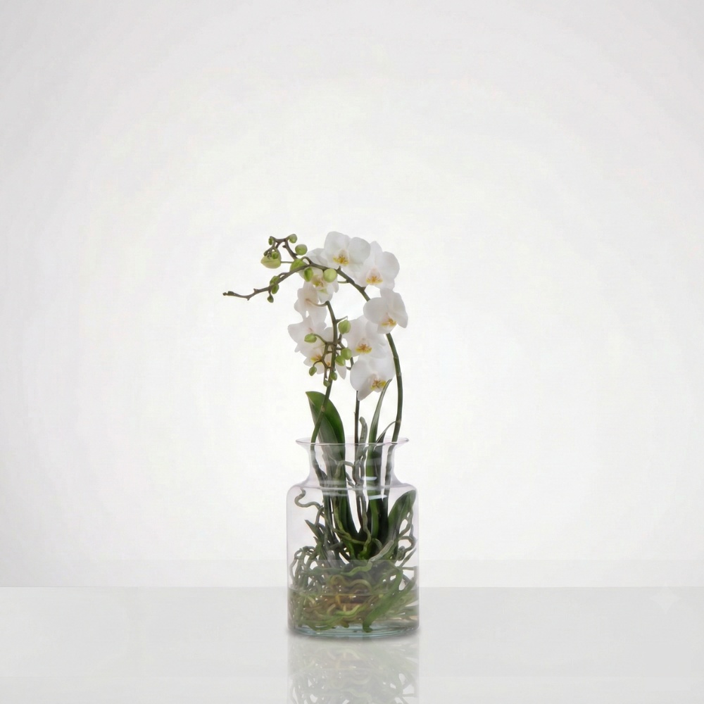 סחלב פלנופסיס בגידול הידרופוני (על בסיס מים), המציג שילוב צבעים קלאסי ועדין: עלי כותרת לבנים ונקיים. הצמח מגיע בתוך ואזת זכוכית שקופה המעניקה מראה מודרני ומרענן, ומתנשא לגובה של כ-35-40 ס"מ (כולל הכלי). פריט עיצובי מושלם שמשדרג כל שולחן או שידה במינימום מאמץ. שימו לב - התמונה להמחשה בלבד, צבע הסחלב יכול מעט להשתנות. הוראות טיפול חשובות: כדי לשמור על בריאות הצמח והשורשים, חשוב לנקות את הכלי עם מים וסבון אחת ל-10 ימים (למניעת הצטברות חיידקים). כמו כן, יש לשמור על מפלס מים נמוך וקבוע של כ-2 ס"מ בתחתית הכלי (כפי שמופיע בתמונה).