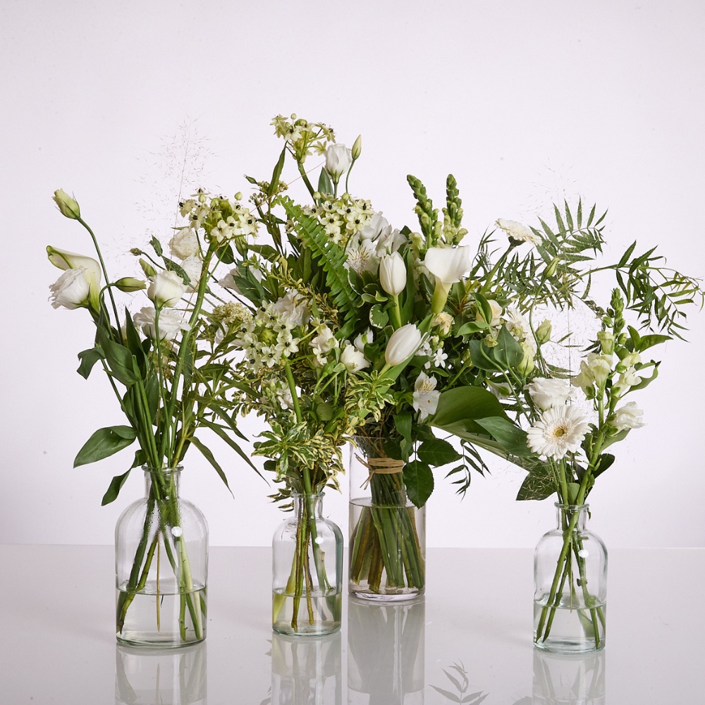 תכולה: זר לבן קלאסי מרשים, 3 בקבוקוני זכוכית Clear Trio עם סידור לבן תואם, אופציה לואזה מתאימה בהנחה.