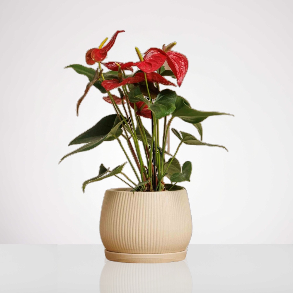 אנטוריום – צמח צבעוני למשרד ולבית, מגיע עם עציץ קרמיקה בקוטר 15 ס"מ. יתרונות: פרחים צבעוניים לאורך כל השנה, קל לטיפול, מוסיף יוקרה. טיפול: אדמה לחה אך לא רטובה, אור בינוני עד גבוה, טמפרטורה 18-28°C.