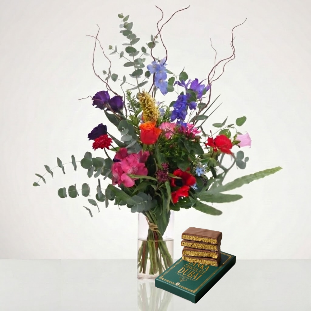 Wild & Celebration הוא מארז מתנה שמח ומאוזן, שמשלב זר פרחים מלא חיים עם תוספות אלגנטיות שמרימות כל רגע. המארז כולל זר Wild Smile לבחירה, אגרטל צילינדר קלאסי מזכוכית ושוקולד איכותי מבית YANKA, שילוב מדויק בין פריחה, עיצוב ופינוק קטן. זר Wild Smile מעוצב בשזירה חופשית וטבעית, עם נוכחות צבעונית ושמחה שמתאימה למגוון אירועים. האגרטל השקוף משלים את המראה ונותן פתרון מוכן להצבה בבית, והשוקולד מוסיף נגיעה מתוקה שמשלימה את החוויה.